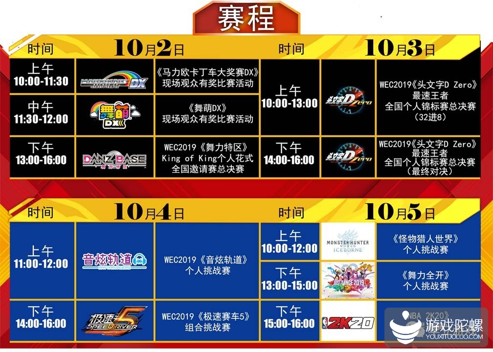 以上赛程安排均为比赛区主舞台的时间安排,10月6日主舞台静态展示,其余时间均可在游园区体验到我们的游戏产品哦!
