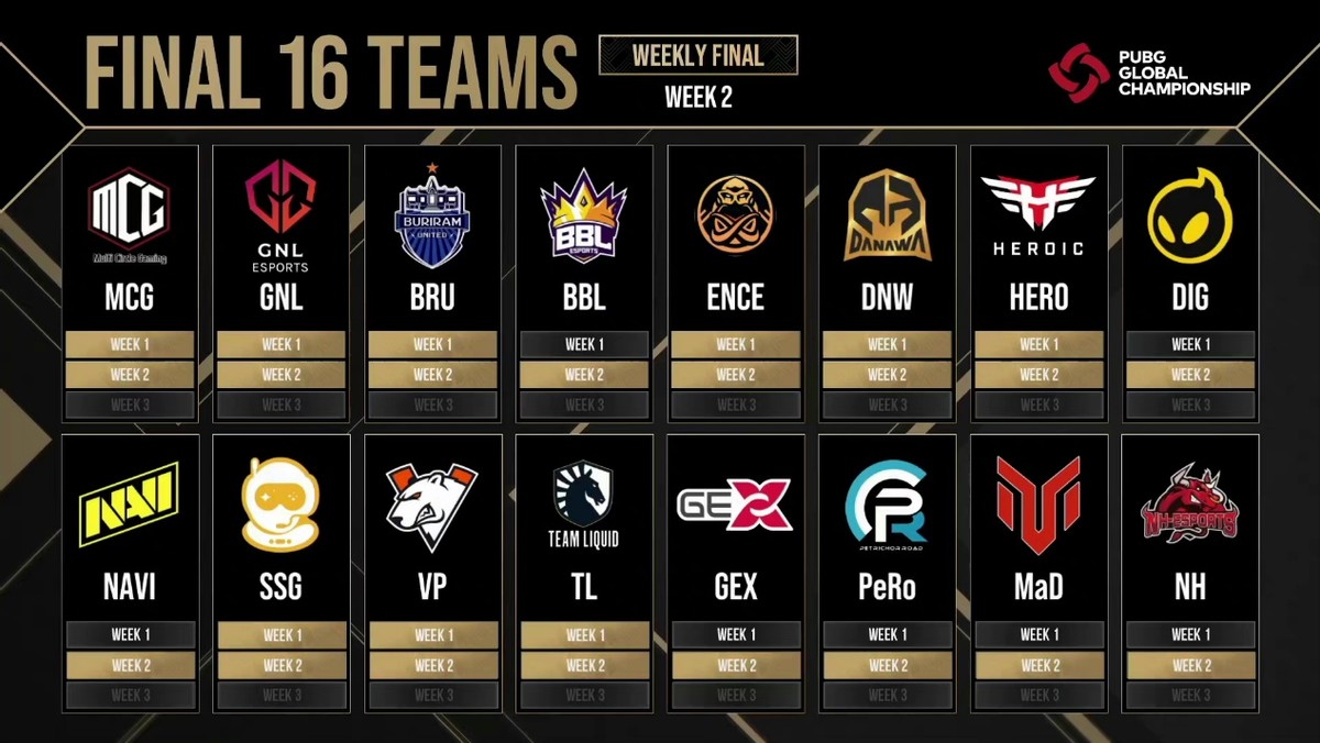 【Krafton Inc.旗下PUBG工作室】信者永恒,竞绽光芒!Krafton Inc. 旗下PUBG工作室举办的PGC 2021(PUBG GLOBAL CHAMPIONSHIP 2021,简称“PGC 2021”)全球总决赛第二周的比赛已经落幕。TL战队凭借两天稳健的发挥,收获50个淘汰,并以81分摘得了本周的周冠军。GNL战队同样收获了50个淘汰与81分,但以吃鸡数的劣势屈居第二。欧洲冠军VP战队一转上周的颓势,以74分位居第三。来自中国台湾的GEX战队本周手感火热,拿下68分排名第四,并收获了全场最高的52个淘汰。PCL赛区的三支队伍MCG、NH和PeRo战队均有吃鸡入账,分别位列第五、第八和第十一名。