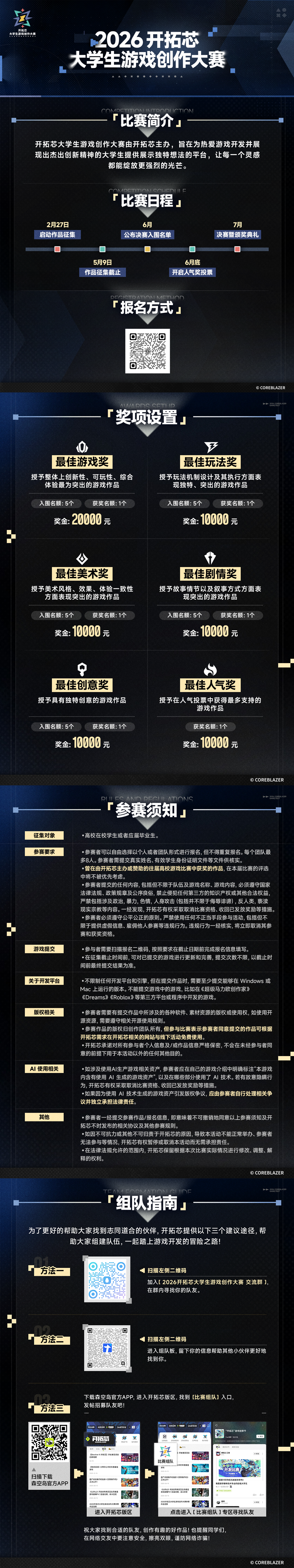 即日起,参赛选手可前往2026开拓芯大学生游戏创作大赛活动官方网站进行报名并提交作品,更多赛事动态及后续活动最新情报,将通过“开拓芯COREBLAZER”官方微信公众号及活动官网实时发布。
