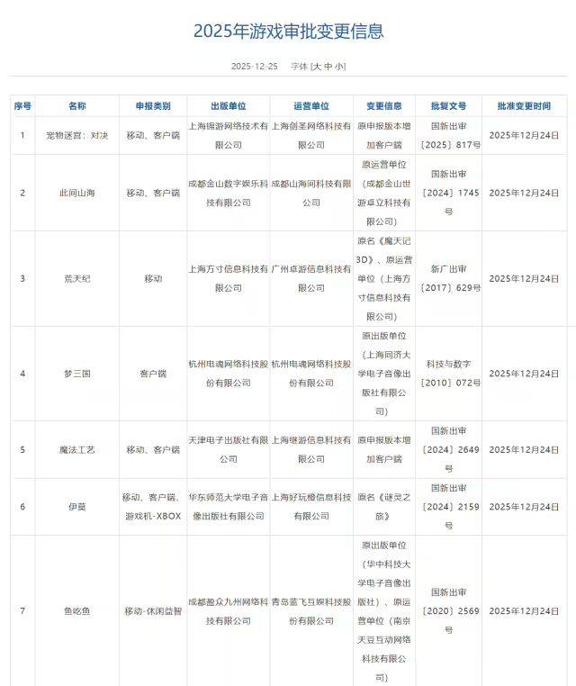 游戏审批变更信息方面,12月有7款游戏过审,包括《宠物迷宫:对决》客户端版本等。