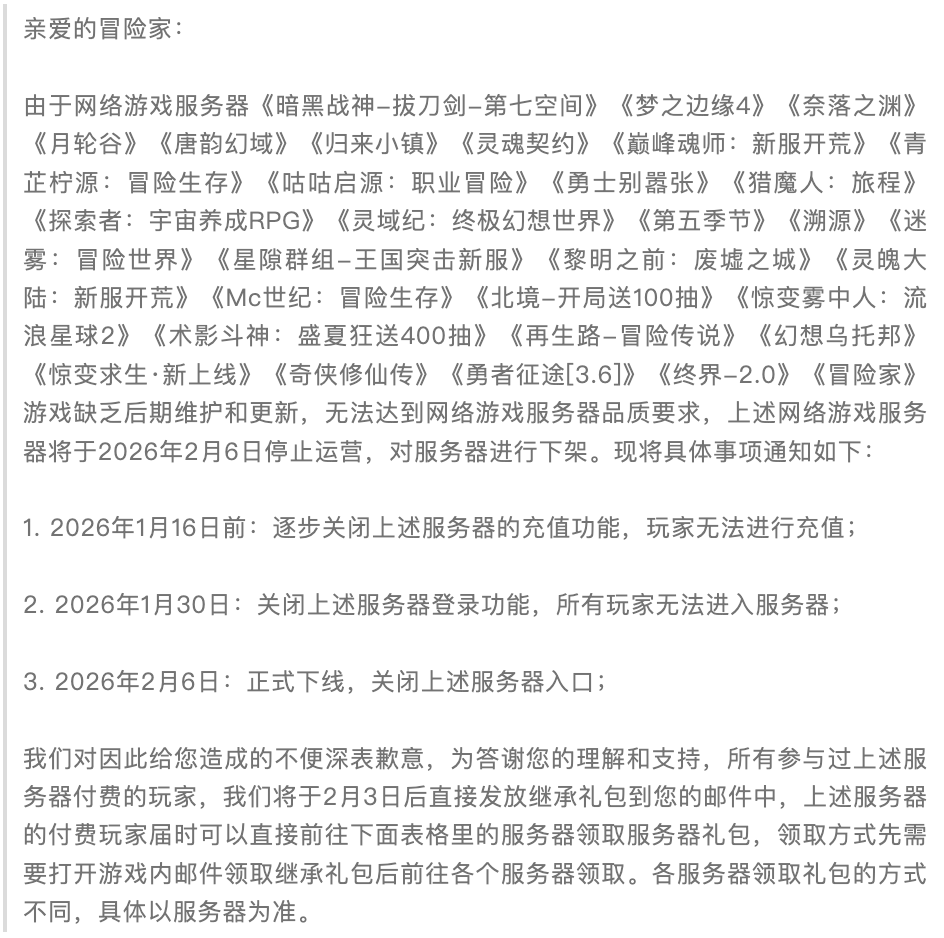 ▎网易《我的世界》中国版:部分网络游戏服务器将于2026年2月6日停服